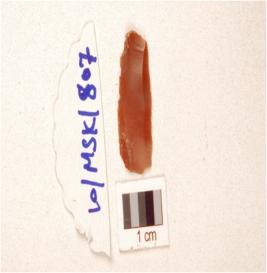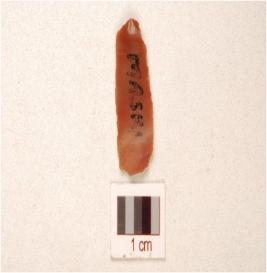 | Description / विवरण | A chert blade double ridge on dorsal, trapezoidal cross-section, prepared platform, bulb on ventral, and use-wear marks on cutting edge. |