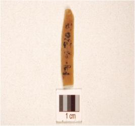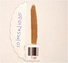 | Description / विवरण | A fragment of a chert blade with double ridge on dorsal prominent bulb on ventral, use wear marks on working edges and trapezoidal section. |