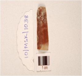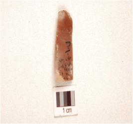 | Description / विवरण | A fragment of a chert blade with double ridge on dorsal, prominent bulb on ventral, use marks on working edges and trapezoidal section. |