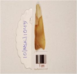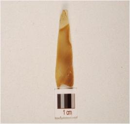 | Description / विवरण | A fragment of a chert blade with double ridge on dorsal, use marks on working edges and trapezoidal section. |