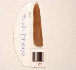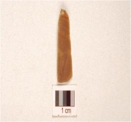 | Description / विवरण | Fragment of a chert blade with single ridge on dorsal, prominent bulb on ventral, use wear marks on working edges and trangular section. |