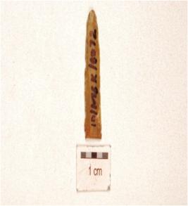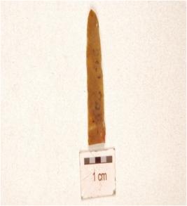 | Description / विवरण | A chert blade prepared platform on the proximal end, flake scars on the surface and partly retouching on the cutting edges. |