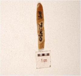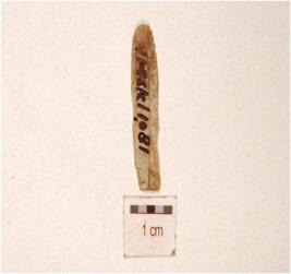 | Description / विवरण | A chert blade flake scars on the dorsal, prepared platform distal end, prominent bulb on the ventral and partly retouching on the cutting edges. |