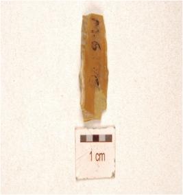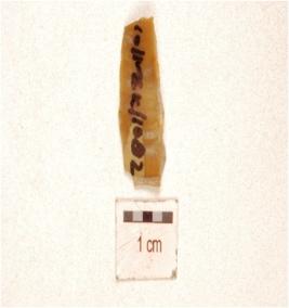 | Description / विवरण | A chert baked blade flake scars and cortex on the surface, partly retouching on one edge. |