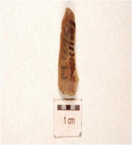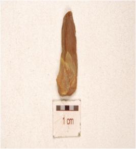| Description / विवरण | A chert blade flake scars and cortex on the surface prominent bulb on the ventral, partly retouching on the cutting edges. |