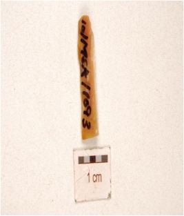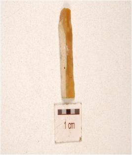 | Description / विवरण | A chert blade flake scars on the surface, platform on the proximal end diffused bulb on ventral, cortex on the surface and partly retouching on the cutting edges. |