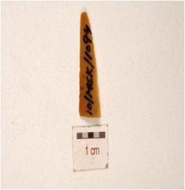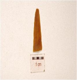 | Description / विवरण | A chert blade flake scars on the surface, prepared platform on the proximal end and distal end pointed partly retouching on the cutting edges. |
