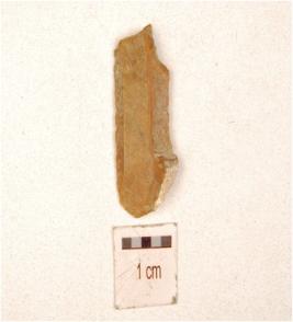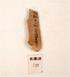 | Description / विवरण | A chert blade flake scars and cortex on the dorsal and partly retouching on the cutting edges. |