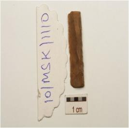 | Description / विवरण | A blade made on chert prepared platform on proximal end, double ridge on dorsal, and use marks on working edges. |