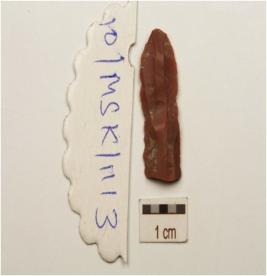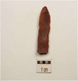 | Description / विवरण | A blade made on chert prepared platform on proximal end, bulb on ventral, and use marks on working edges. |