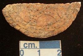 | Description / विवरण | Fragment of a bone disc, one face is decorated with incisions comprising short strokes on the periphery, two concentric circles filled with dots. The mid space has loops around and the central ground is filled with dots. The under side is plain. |