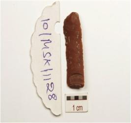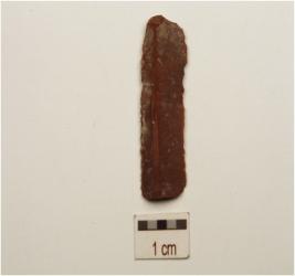| Description / विवरण | A blade made on chert prepared platform on proximal end, single ridge on dorsal, bulb on ventral, and use marks on working edges. |