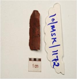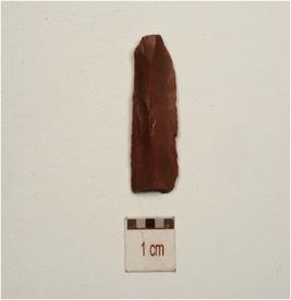 | Description / विवरण | Fragment of a chert blade with single ridge on dorsal, prominent bulb on ventral, use wear marks on working edge and triangular cross-section. |