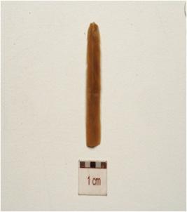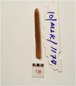 | Description / विवरण | Fragment of a chert blade with single ridge on dorsal, use wear marks on working edges, prominent bulb on ventral and triangular cross-seciton. |