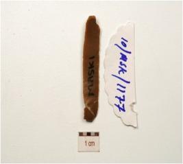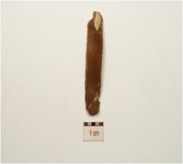 | Description / विवरण | Fragment of a chert blade with single ridge on dorsal, prominent bulb on ventral use-wear marks on dorsal and triangular cross-section. |