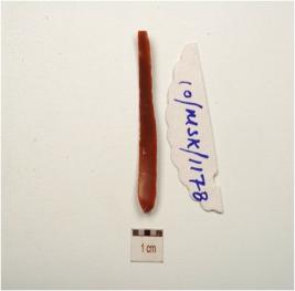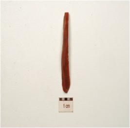 | Description / विवरण | Fragment of a chert blade with single ridge on dorsal, prominent bulb on ventral, use-wear marks on working edges and triangular cross-seciton. |
