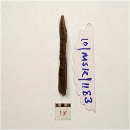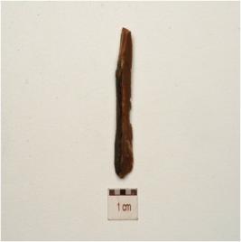 | Description / विवरण | Fragment of a chert blade with single ridge on dorsal, diffused bulb on ventral, use wear marks on working edges and triangular cross section. |