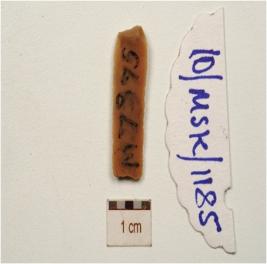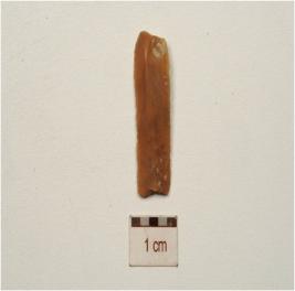 | Description / विवरण | Fragment of a chert blade with single ridge on dorsal, prominent bulb on dorsal, prepared platfrom use wear marks on working edges and triangular cross-section. |