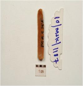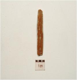 | Description / विवरण | Fragment of a chert blade with double ridge on dorsal, use-wear marks on working edges, prominent bulb on ventral and trapezoidal cross-section. |