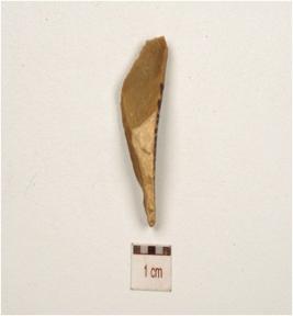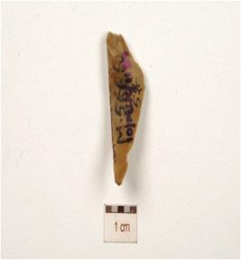 | Description / विवरण | A chert blunted blade with cortex on dorsal chipped off, diffused bulb on ventral, prepared platform and triangular cross-section. |