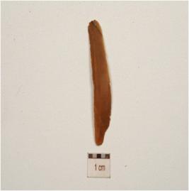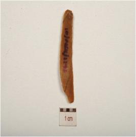| Description / विवरण | A chert blade with double ridge on dorsal, bulb on ventral, prepared platform and trapezoidal cross-section and irregular retouch on right cutting edge. |