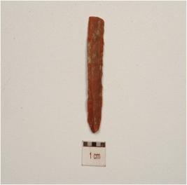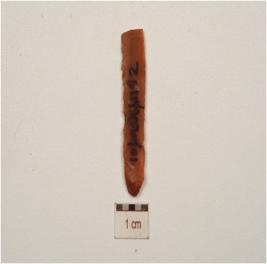 | Description / विवरण | A chert blade with double ridge on dorsal, chipped off bulb on ventral, prepared platform trapezoidal cross-section, use wear marks on cutting edge and broken along distal end. |