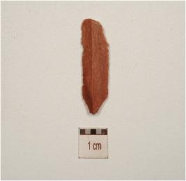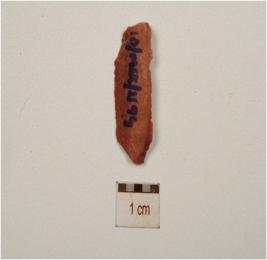 | Description / विवरण | A chert blade with prominent mid-ridge on dorsal, triangular cross-section, use wear marks on cutting edge and broken along both ends. |