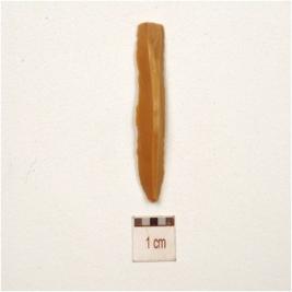 | Description / विवरण | A chert blade with double ridge on dorsal diffused bulb on ventral, prepared platform, trapezoidal cross-section, irregular retouch on left cutting edge and broken along distal end. |
