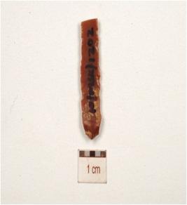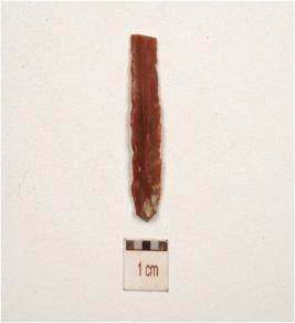 | Description / विवरण | A chert blade with double ridge on dorsal, bulb on ventral, striking platform, irregular retouch on left cutting edge, trapezoidal cross section, and broken along distal end. |