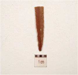 | Description / विवरण | A chert blade with prominent mid-ridge on dorsal, triangular cross-section, irregular retouch on right cutting edge and broken along proximal end. |
