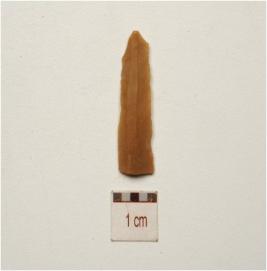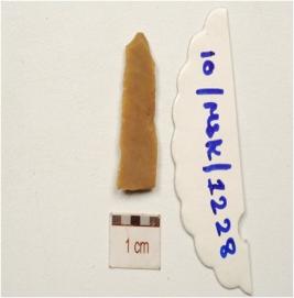 | Description / विवरण | Fragment of a parallel sided chert blade with two ridges on dorsal broken from both ends, trapezoidel cross section, and use wear marks along cutting edges. |