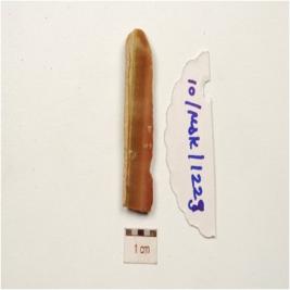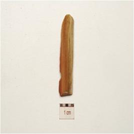 | Description / विवरण | A parallel sided chert blade with two ridges on dorsal, bulb on ventral, broken along at distal end, trapezoidel cross-section and use wear marks on cutting edges. |