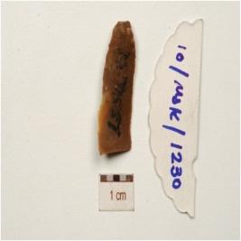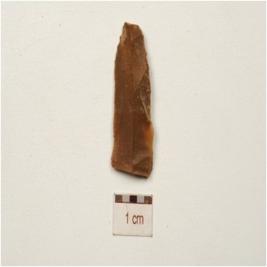 | Description / विवरण | chert parallel sided blade with a ridge on dorsal diffused bulb on ventral, broken along at distal end, trapezoidal cross-section and use wear marks on cutting edges. |