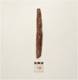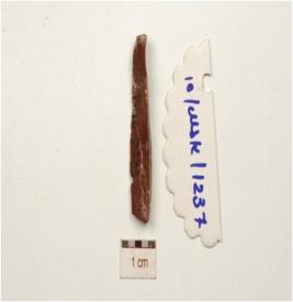 | Description / विवरण | chert parallel sided blade with a ridge on dorsal, diffused bulb on ventral, broken along at distal end triangular cross-section and use wear marks along cutting edges. |