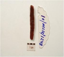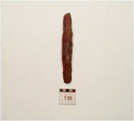 | Description / विवरण | Fragment of a chert blade with single ridge on dorsal, prominent bulb on ventral, use-wear marks on working edges and triangular cross-section. |