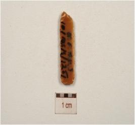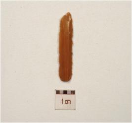 | Description / विवरण | A blade of chert flake scars on the dorsal and retouched cutting edges. |