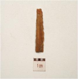 | Description / विवरण | A blade made on chert flake scars on the dorsal and retouched cutting edges. |