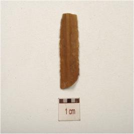 | Description / विवरण | A blade chert flake scars on the dorsal and retouched cutting edges. |