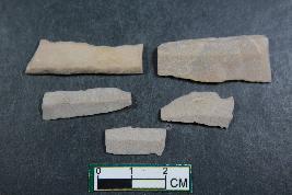 | Description / विवरण | Fragments of blades with two dorsal ridges in four of them and one dorsal ridge in one of them.One of them has bulb of percussion.They have smooth surface. |