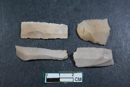 | Description / विवरण | Fragments of blades with two dorsal ridges in two of them , one dorsal ridge in one of them and three dorsal ridges in one of them.One of them has bulb of percussion.They have smooth surface. |