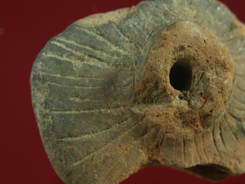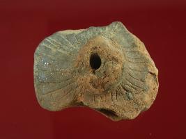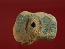 Trench ZA1, Qdt-2, Depth 8.18 mtrs at peg B1, Stratum Layer 23 It is a wheel made of baked clay. It was circular in shape but damaged now. Lines carved on its surface. Surface is rough. Appearance is brown. It was used in toy cart.