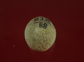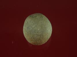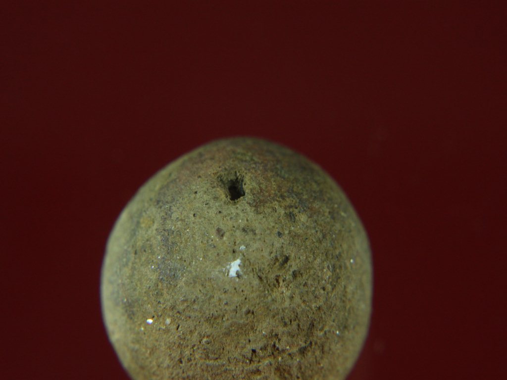 Trench FX-3, LxB-D XXX3 .50 mtrs x 2.25 mtrs - 4.30 mtrs Below peg XXVII3, Stratum Layer 17 This is a ball made of baked clay. It is circular in shape. Some irregular marks allover the surface. There is a depression at one side. It has a hole through it. Appearance is of grey colour.