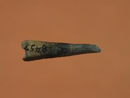 | Description / विवरण | Trench FX-1, LxB-D XXX .40 mtrs x 3.50 mtrs - 5.30 mtrs Below peg XXVII3, Stratum Layer 22 This is a stylus made of bone. It is a pointed object form its both ends. Colour of object is grey brown. Used for ornamental purpose to ornate eyes |