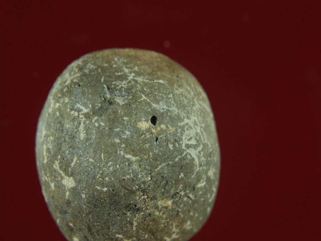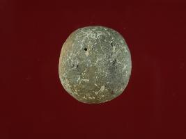 Trench YA1, Qdt-3, Depth 3.05 mtrs B peg A1, Stratum Pit 6 sealed by Layer 7 Ball made of baked clay. It is almost round in shape. Surface is rough. Irregular marks present on its surface. A small hole on it. Appeareance is of greyish at most of its place and little damaging on one side.