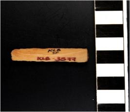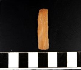 | Description / विवरण | A small blade of chert stone having double ridge, trapezoid cross section, having sharp working edges, flat end rectangular in shape. |
