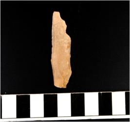 | Description / विवरण | A blade of chert stone having ridge on the surface, sharp cutting edge on one side, bulb on the ventral sides, irregular shape. |