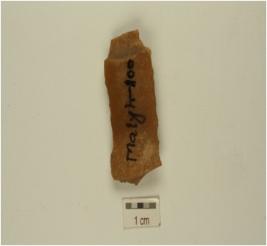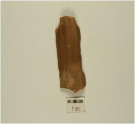 | Description / विवरण | A blade fragment made on chert with double ridge, use wear marks along the working edge and trapezoidal cross section. |