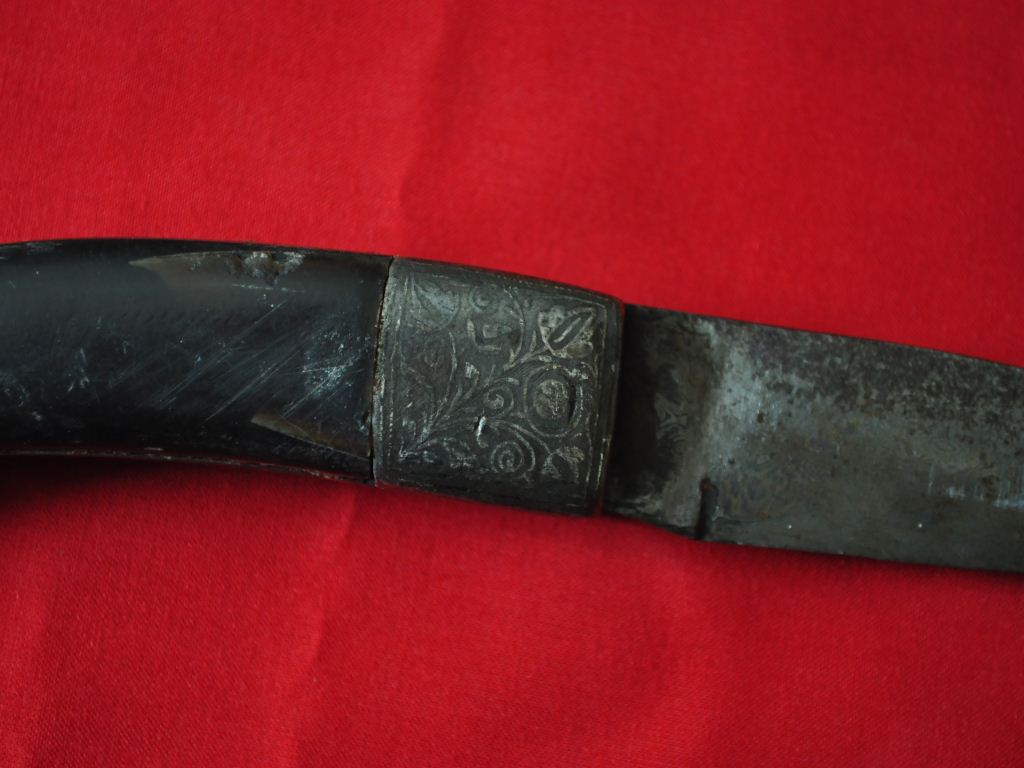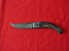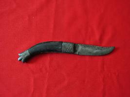 It is a knife made of wood and iron. It may be used for cutting and other defence mode.Its color is black and brown.It has two part of it.It has some design on its grip.The upper side has a blade while bottom part has designed.