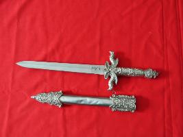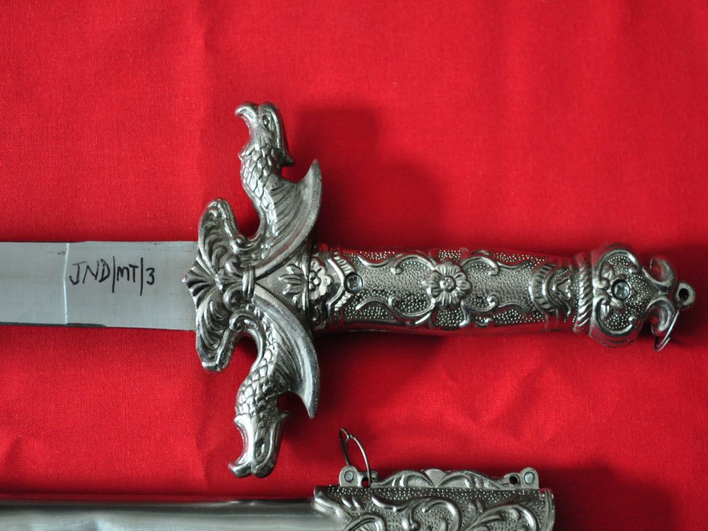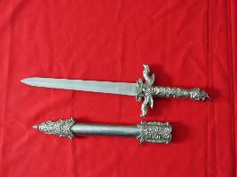 It is a knife made of steal and plastic. It may be used for cutting and other defence mode.Its color is black and brown.It has two part of it.It has some dragen on its grip.The upper side has a blade while bottom part has designed.