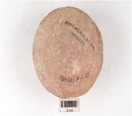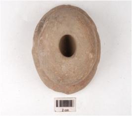 | Description / विवरण | A handmade terracotta dabber, circular convex top with a circular socket at centre, circular convex working area treated with red slip and hour glass cross section. |